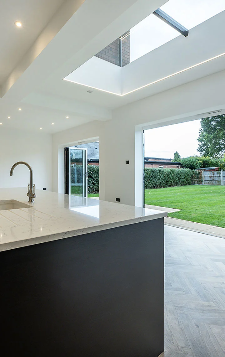 At the heart of the home is the family kitchen: our Kensington Range cabinetry paired with White Arabesque worktops, a Belfast sink, and Bosch appliances. An atrium ceiling over the dining area adds drama and light. The open-plan layout was designed to work as well for everyday family life as it does for entertaining, with a generous family area flowing out to the garden through bifold doors. The ground floor also features a living room, creating a private space away from the open-plan areas.